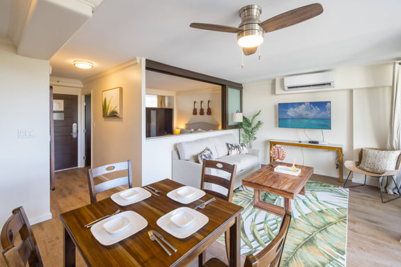 Enjoy the best of Waikiki in this intimate, boutique-style condominium resort. Its contemporary style fits perfect with its setting in the Waikiki Beach Walk® shopping and dining district. Each one- and two- bedroom condominium features finely-crafted furniture, custom hard wood flooring, floor to ceiling windows, beautifully appointed kitchens and dining area, air conditioning, flat screen televisions, pampering bathrooms with walk in-shower, spacious tiled lanais with city or partial ocean views and complimentary high speed internet access.